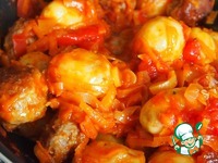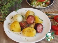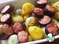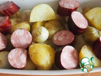 Полукапченую колбасу (или по вашему усмотрению) порезать на куски примерно 3 см и разложить сверху на картофель. |