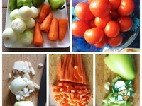 Пока выпекаются перцы, подготовим овощи для подливы. Моем и чистим лук, морковь, томаты и оставшиеся 4 болгарских перца, которые я также добавляю в подливу. Нарезаем кубиками лук, морковь и перец. |