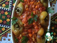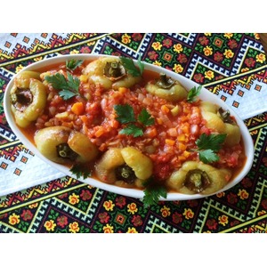 Я так часто это блюдо готовлю, что пропорции ингредиентов всегда разные, в зависимости от необходимого количества, а также в зависимости от повода. Поясню, если блюдо подаю на праздничный стол, то перцы у меня целиком с хвостиком. Если же просто на каждый день, то перцы очищаю от семян и хвостика, режу на кусочки и добавляю в подливу. Вкус не меняется, а есть куда удобнее уже чищенные, особенно для деток. Если готовлю на зиму, также чищу от семян, т. к. в банку закручивать семена, точно нет никакого смысла. Или другой вариант на зиму, перцы запекаю, очищаю и замораживаю. Подливу закручиваю в банки. А при подаче к столу, перцы размораживаю и подаю вместе с подливой, вкус практичекси как и летом свежеприготовленных перцев.