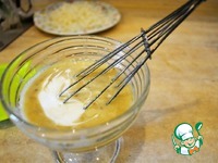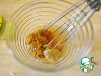 Время не теряем, а готовим заправку - в мисочке соединяем горчицу с уксусом, постоянно помешивая вливаем потихоньку масло - масса станет чуть вязкой, помутнеет... |