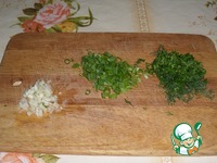 Мелко нарезаем зелень и измельчаем чеснок. |