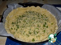 Посыпаем пирог оставшейся половиной сыра, зеленью и специями (по вкусу). Ставим пирог в разогретую духовку. |
