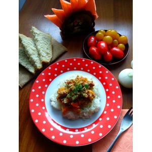 На тарелку выложить рисовую подушку, на нее сверху подливку из фарша. Приятного аппетита! |