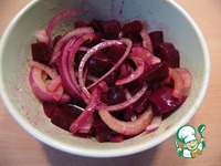 Свеклу нарезать небольшими кубиками, лук - полукольцами. Выложить из в маринад, убрать в холодильник на 20 минут. |