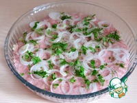 Укроп и петрушку измельчить, посыпать свежей зеленью слой фарша и лука. |