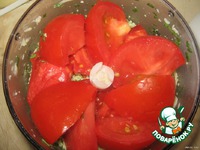 Добавляем к ней помидоры. Можно снять с них кожицу, ошпарив их кипятком, но я не снимала и как выяснилось - она совсем не чувствуется. Измельчаем. |