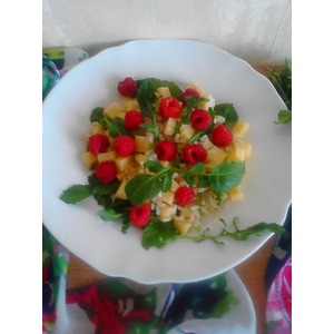 Описание: Быстрый летний салат с рисом, сыром, рукколой и малиной.