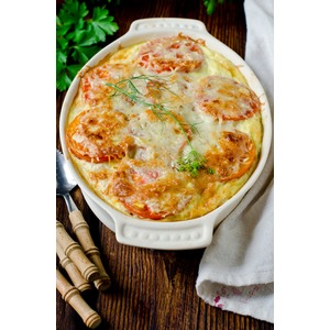 Для заливки необходимо взбить венчиком сливки, яйца и половину сыра, посолить и поперчить. Оставшимся сыром посыпать запеканку, затем залить сливочно- яичной массой. |