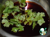 4. Соевый соус влить в сотейник, добавить веточки кинзы и довести до кипения. Подержать немного на огне. Соус должен слегка загустеть. |