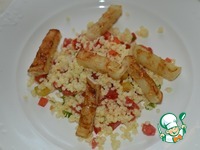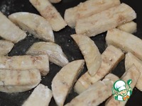 1. Баклажан почистить, нарезать брусочками, присолить и оставить на 10 минут. У меня молодой белый и я его не чистила. |