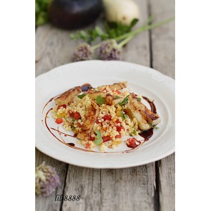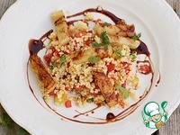 6. Готовое пшено смешать с нарезанными овощами, посолить, поперчить. На тарелку выложить пшено, сверху ломтики баклажана. |