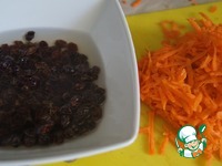 А пока займёмся начинкой. Заливаем кипятком изюм на 5 минут и трём морковь. |