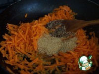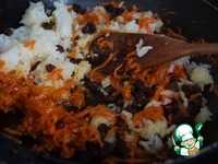 В сковороду к готовой моркови добавляем изюм и отваренный рис. |