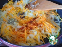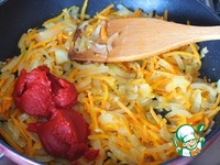 Добавить томатную пасту (2 ст. ложки), воду (2/3 стакана), лавровый лист. Смесь тушить несколько минут (5-10 мин.) |