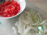 Помидор надрезаем крест-накрест, заливаем кипятком и снимаем шкуру. Нарезаем кубиками. Лук режем полукольцами. |
