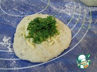 Каждый кусочек теста раскатать или придавить ладошкой, на середину положить натертый сыр и укроп. |