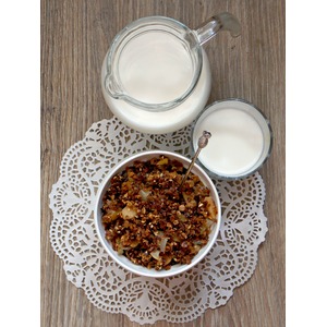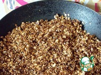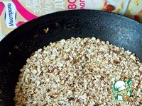 На сухую сковороду насыпать овсяные хлопья "Экстра" от фирмы "Мистраль". Добавить орехи, кунжут и обжарить на среднем огне 2-3 мин. |