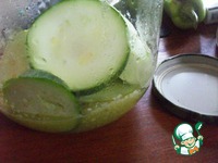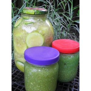 Если будете использовать зелень, то взятое вами количество травки разделите пополам, 1/2 часть положите на дно банки. Потом налейте заливку огуречную 3-4 ст. л. Положите кольца кабачков. И так чередуйте - заливка, кабачки, заливка, кабачки. Если сразу сложить все кабачки, а потом заливку, то она может не заполнить все пустоты. Сверху опять положите зелень. Хорошо бы на самый верх, под крышку положить лист хрена или же его корень. Это не даст образоваться плесени. Заготовка не проходит термообработку, хранится в холодильнике, либо погребе. |