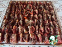 Поставить противень и вялить помидоры около 4-х часов при открытой духовке на 2-3 см. |