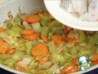 Выкладываю кусочки рыбы к овощам, солю и жарю до готовности. Обычно по времени это ещё минут 7-10. Сначала рыба дает много сока. Когда жидкость практически вся испарится - блюдо готово! |