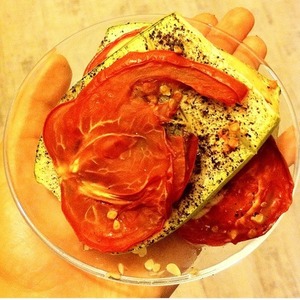 Укладываем помидоры вот такой вот "шапочкой" на каждый ломтик) |