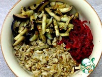 Баклажаны пустили сок, их надо промыть, отжать и обжарить на сковороде с добавлением буквально капли масла. Сложить в салатник грибы, добавить баклажаны и натертую на терке свеклу. |