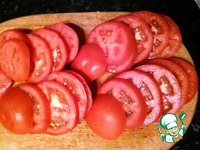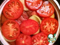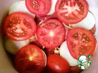 Складываем мясо с луком и помидорами в посуду с крышкой. Складываем слоями. Мясо - лук - помидор. У меня получилось три слоя. Завершаем помидорами. |