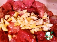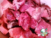 Подготавливаем мясо, нарезая его на кусочки. Я всегда режу крупные кусочки. Примерно 40-50 грамм каждый. Так мясо получается сочным и нежным внутри. |
