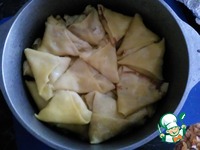 Вот так вот выглядит полный казан. Накрываем его плотно крышкой или заворачиваем фольгой. Отправляем для запекания в духовку разогретую до 150 градусов на 30 минут. |