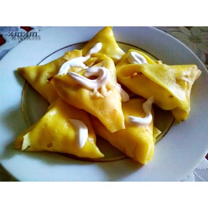Начнем сворачивать мули треугольником. Кладем ложку начинки на край блина и начинаем складывать |