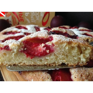 Тесто переложить в форму, сверху слегка вдавить сливы. |