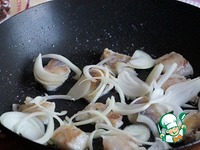 Половинку маленькой луковицы ( или четвертинку средней) нарезаем полукольцами или перьями, добавляем к рыбе, делаем огонь минимальным и и даем рыбке потомиться с луком. |