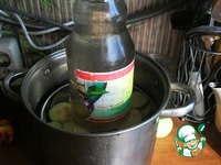 Кладем на баклики крышку, утапливая их. Сверху ставим гнет (у меня 1л бутылка с водой). Гнет нужен лишь для того, чтоб баклики не всплывали. Оставляем на 1 час. |