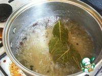 В ковшик наливаем 0,5 л воды, добавляем соль, сахар, перцы горошком и лавр. Доводим до кипения, вливаем уксус, кипятим еще 1-2 минуты и выключаем. |