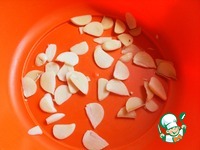 Далее берем просторный тазик или миску, нарезаем туда чеснок пластинами, кладем острый перец. |