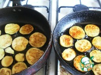Готовый маринад горячим выливаем в тазик. Баклажаны обжариваем на раскаленном масле, на среднем огне до румяности с двух сторон. Я это делала на 2-х сковородках, так быстрее. |