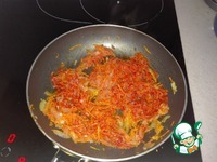 Натираем на мелкой терке морковь и отправляем ее к луку. Как только морковь поменяет цвет добавим столовую ложку томат-пасты. |