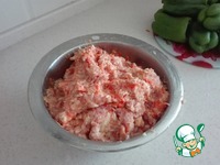 Соединяем фарш, рис, лук, морковь, добавляем хмели-сунели, молотый черный перец и солим по вкусу. Все это хорошенько вымешиваем. |