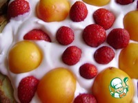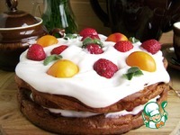 Торт разрезать пополам, выложить половину сливочного крема на нижнюю часть, разложить абрикосы и клубнику. Накрыть второй половиной, выложить сверху сливки – можно из кондитерского мешка или шприца. |