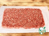 Фольгу сворачиваю вдвое, выкладываю фарш в форме прямоугольника. |