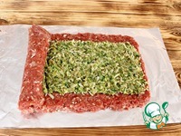 На фарш выкладываю начинку, отступив по краям по 1-2 см, разравниваю. С помощью фольги сворачиваю рулет. |