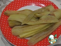 Баклажан нарезать на тонкие пластинки и обжарить. Промокнуть бумажным полотенцем, чтобы убрать лишний жир. |
