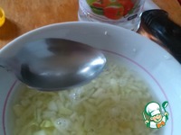 Первым делом нужно мелко нарезать лук (чем мельче, тем лучше). Добавить немного кипятка и столовую ложку уксуса, чтобы ушла горечь. Оставляем лук на некоторое время |
