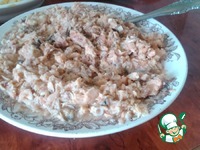 Горбушу разминаем вилкой (сок из консервной банки оставляем, так будет сочнее) |
