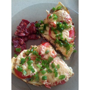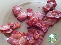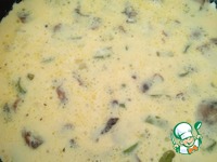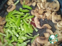 Когда бекон будет готов перекладываем его на тарелку. В ту же сковороду, где готовился бекон засыпаем порезанные грибы. Жарим 2-3 минуты на большом огне. Потом добавляем болгарский перец и жарим ещё 2-3 минуты. Потом солим и перчим по вкусу, можно добавить ещё щепотку орегано, накрываем крышкой, убавляем огонь до минимума и оставляем ещё на 5 минут.