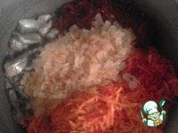Морковь и свеклу натираем на крупной терке. Все складываем в посуду для приготовления. |