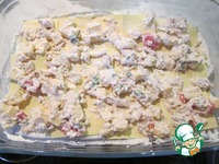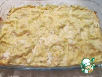 Собираем лазанью. Половину сырной смеси без курицы распределить по дну формы, сверху выложить листы для лазаньи и 1/2 куриной смеси. Слои повторить и закончить листами теста. Сверху распределить оставшуюся сырную смесь и потереть оставшийся сыр.