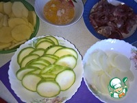 Овощи чистим и режем кружочками шириной 0,5см, лук режем кольцами шириной 0,5см. Масло нужно растопить. |
