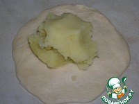 Тесто разделить на шарики. Шарик раскатать в лепешку (я делаю руками), положить начинку и защипать края. |