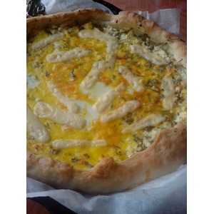 Смотрим по времени, когда тесто начнёт подрумяниваться, в отдельной тарелке разбиваем два яйца, мешаем вилкой и выливаем сверху на наш пирог, это где-то за 10 минут, перед тем как вытягивать его из духовки.